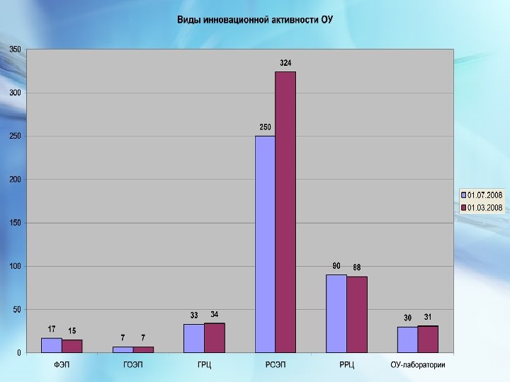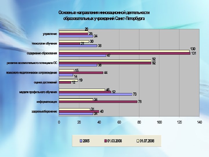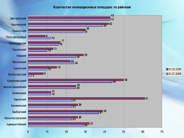 На 1 июля 2008 г. в Санкт-Петербурге осуществляли инновационную деятельность 427 образовательных учреждений в следующих режимах: • федеральная экспериментальная площадка – 17 ОУ; • городская опытно-экспериментальная площадка – 7 ОУ; • городской ресурсный центр – 33 ОУ; • образовательное учреждение-лаборатория – 30 ОУ; • районная опытно-экспериментальная площадка – 250 ОУ;