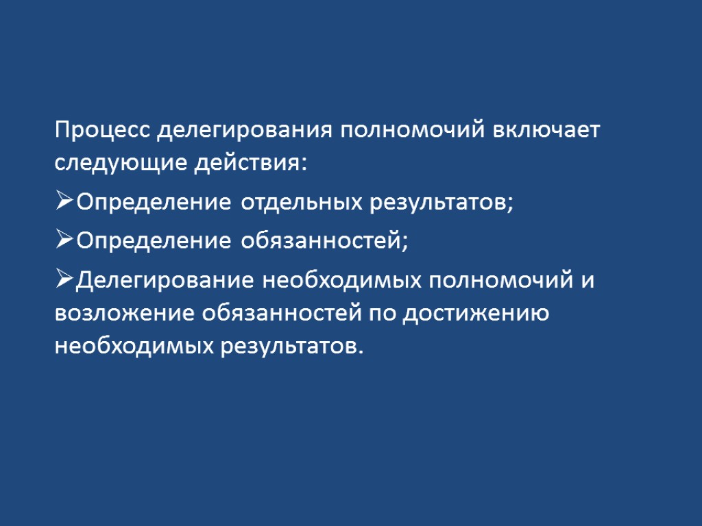 Процесс делегирования полномочий включает следующие действия: Определение отдельных результатов; Определение обязанностей; Делегирование необходимых полномочий и возложение обязанностей по достижению необходимых результатов.
