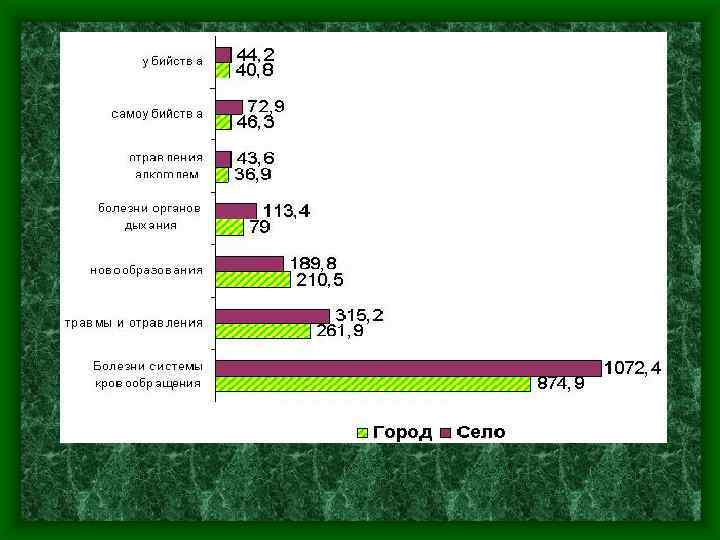 РАЗВИТИЕ СЕЛЬСКОГО ЗДРАВООХРАНЕНИЯ ХАРАКТЕРИСТИКА ДЕМОГРАФИЧЕСКИХ ПОКАЗАТЕЛЕЙ СЕЛЬСКОГО НАСЕЛЕНИЯ РОЖДАЕМОСТЬ СЕЛЬСКОГО НАСЕЛЕНИЯ НА 16, 7% ВЫШЕ, ЧЕМ У ГОРОДСКОГО НАСЕЛЕНИЯ СМЕРТНОСТЬ СЕЛЬСКОГО НАСЕЛЕНИЯ НА 19, 3% ВЫШЕ, ЧЕМ У ГОРОДСКОГО НАСЕЛЕНИЯ МЛАДЕНЧЕСКАЯ СМЕРТНОСТЬ СЕЛЬСКОГО НАСЕЛЕНИЯ НА 31, 9% ВЫШЕ, ЧЕМ У ГОРОДСКОГО НАСЕЛЕНИЯ СМЕРТНОСТЬ СЕЛЬСКОГО НАСЕЛЕНИЯ ОТ БОЛЕЗНЕЙ СИСТЕМЫ КРОВООБРАЩЕНИЯ НА 18, 8% ВЫШЕ, ЧЕМ У ГОРОДСКОГО НАСЕЛЕНИЯ СМЕРТНОСТЬ СЕЛЬСКОГО НАСЕЛЕНИЯ ОТ НОВООБРАЗОВАНИЙ НА 11, 9% НИЖЕ, ЧЕМ У ГОРОДСКОГО НАСЕЛЕНИЯ СМЕРТНОСТЬ СЕЛЬСКОГО НАСЕЛЕНИЯ ОТ ВНЕШНИХ ПРИЧИН СМЕРТИ НА 43, 6% ВЫШЕ, ЧЕМ У ГОРОДСКОГО НАСЕЛЕНИЯ СМЕРТНОСТЬ СЕЛЬСКОГО НАСЕЛЕНИЯ ОТ БОЛЕЗНЕЙ ОРГАНОВ ДЫХАНИЯ НА 56, 1% ВЫШЕ, ЧЕМ У ГОРОДСКОГО НАСЕЛЕНИЯ СМЕРТНОСТЬ СЕЛЬСКОГО НАСЕЛЕНИЯ ОТ БОЛЕЗНЕЙ ОРГАНОВ ПИЩЕВАРЕНИЯ НА 4, 5% НИЖЕ, ЧЕМ У ГОРОДСКОГО НАСЕЛЕНИЯ
