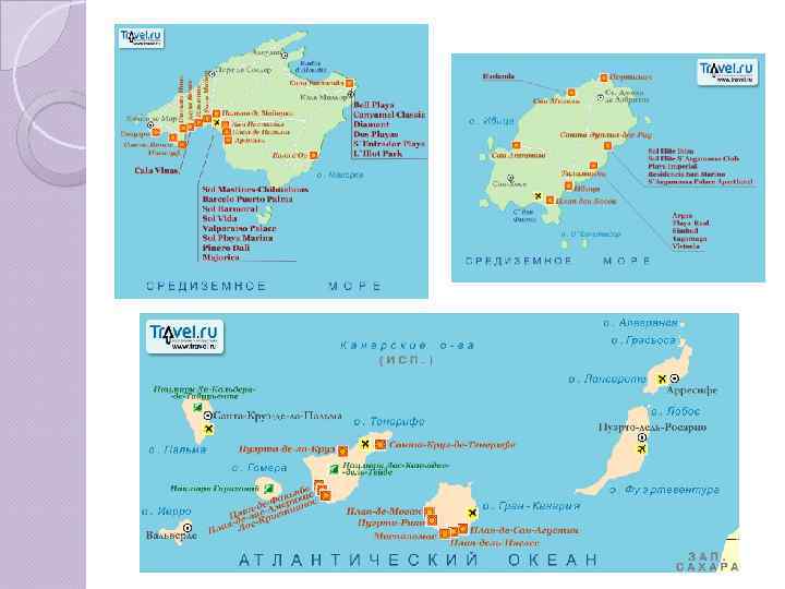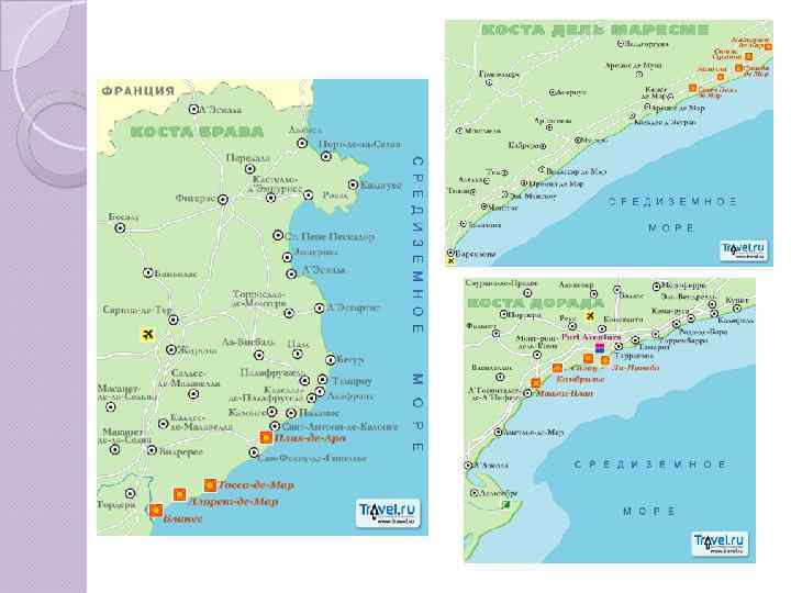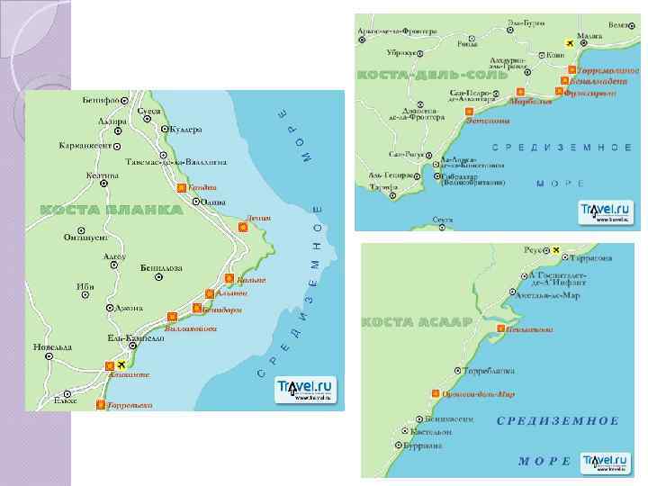 Испания Материковая часть: Коста-Брава Коста-дель-Маресме Коста-дель-Гарраф Коста-Дорада Коста-Бланка Коста-дель-Соль Коста-де-ла-Луз Канарские острова: Тенерифе Фуэртовентура Гран Канария Лансароте Балеарские острова: Ибица Майорка Менорка