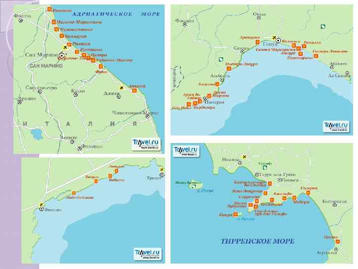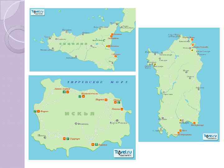Италия Лигурийское побережье Ø Тосканская Ривьера Ø Лигурийская Ривьера Рапалло Санта Маргерита Лигуре Портофино Генуя Адриатическое побережье Ø Венецианская Ривьера Линьяно Лидо ди Езоло Римини Тирренское побережье Ø Неаполитанская Ривьера • Амальфи • Позитано • Сорренто • Равелло Острова: Сицилия Сардиния Искья Капри