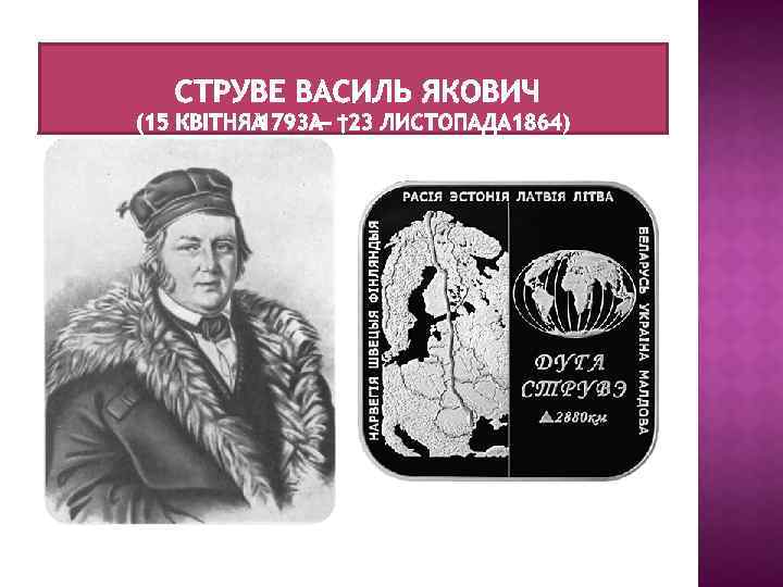 Василь Якович Струве — російський астроном і геодезист німецького походження, один із творців зоряної астрономії, член Петербурзької академії наук (з 1832 р. ). За особистої участі Струве провели градусний вимір дуги меридіану на величезній відстані від Льодовитого океану до дельти Дунаю (Дуга Струве). У підсумку було отримано цінні матеріали для визначення форми й розмірів Землі