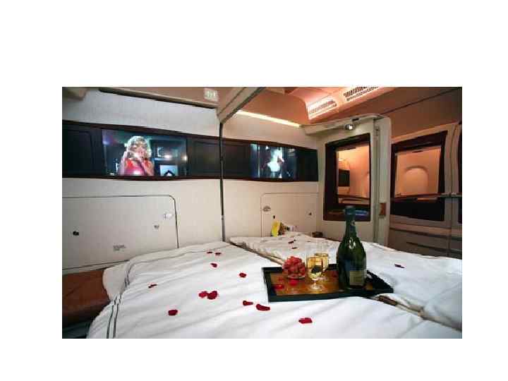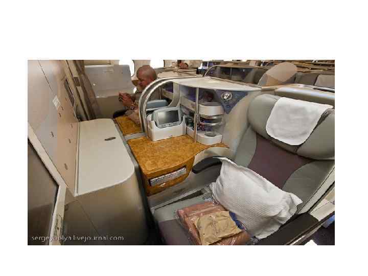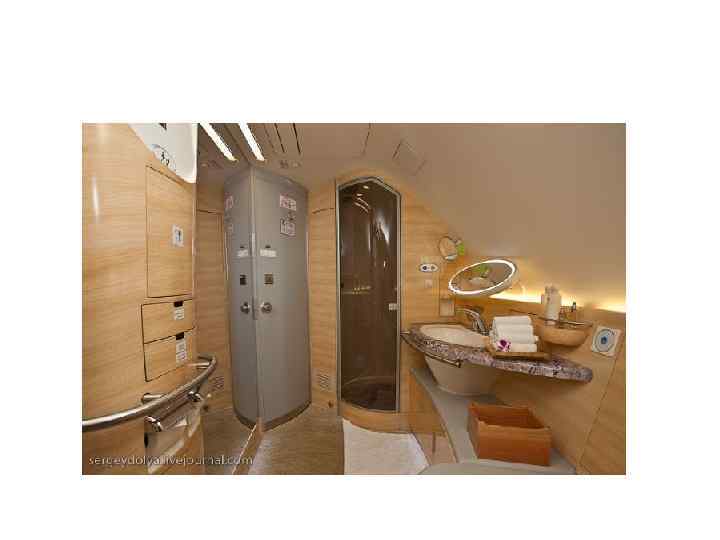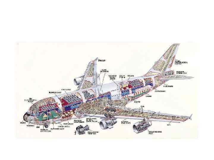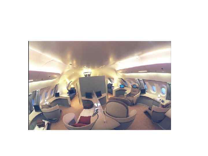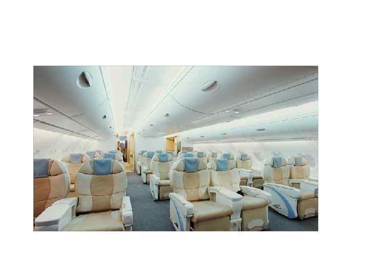 • Самолет А-380 рассчитан на 600 пассажирских мест, оснащен четырьмя уникальными двигателями, управление – полностью цифровое. • На борту нового самолета созданы небольшие офисы, деловые центры, спальные отсеки, места для развлечений, спортивные и игровые залы, которые размещены под полом главной палубы, душевые кабины, магазины и бары. • Для членов экипажа есть необходимые места для отдыха, в том числе и спальные, а также современные оборудованные кухонные блоки.