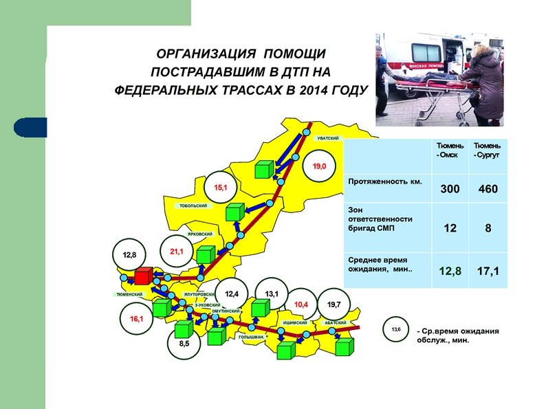 Региональная программа “Развития здравоохранения Тюменской области до 2020 года“ Подготовка медицинских работников для оказания медицинской помощи при ДТП Все работники скорой помощи прошли подготовку на базе ССМП города Тюмени. Проведены практические зенятия, оказание медицинской помощи при ДТП, с использованием имеющегося оборудования. Все автомашины дополнительно оснащены спинальными щитами, вакумными шинами. Бригада интенсивной терапии, аппаратом для проведения СЛР „автопульс“и набором для внутрикостной инфузии.