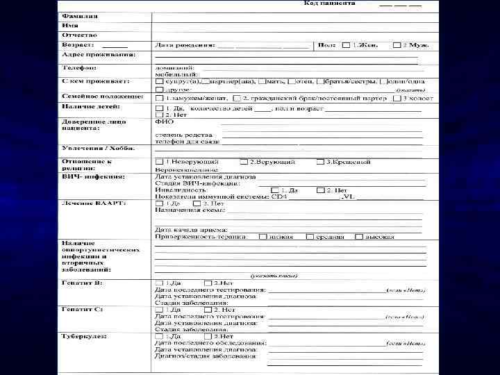 Группа больных «паллиативной помощи» - Стадия 4 В (СПИД) в фазе прогрессирования, страдающие оппортунистическими заболеваниями. -Стадии 4 В (СПИД) в фазе ремиссии, имеющие тяжелые последствия перенесенных заболеваний. - Нарушения высших психических функций, двигательные неврологические и психические расстройства как результат перенесенных вторичных заболеваний, инсульта, черепномозговой травмы, злоупотребления психоактивными веществами. - Длительный стойкий болевой синдром. -Тяжелое поражение легких (фаза распада) или костной системы туберкулезной этиологии - Декомпенсированный цирроз печени. - Эндокардит с формированием пороков сердца. - Онкологическое заболевание, 4 стадия. - Хроническими заболевания, не связанные с ВИЧ-инфекцией (бронхиальная астма, ХНЗЛ, сахарный диабет I типа, НЯК и т. п. ), в стадии обострения. -Глубокие трофические расстройства (трофические язвы, пролежни). - Другие клинические состояния, приводящие к стойкому снижению или утрате физических или психических функций и требующие постоянного интенсивного ухода за больным. -ВИЧ-инфицированные больные, имеющие инвалидность первой группы. - Больные ВИЧ-инфекцией с признаками выраженной социальной дезадаптации (отсутствие стабильного местожительства, утрата документов, удостоверяющих личность, финансовые доходы ниже уровня прожиточного минимума, отсутствие людей в микросоциальном окружении, которые могут принимать участие в уходе).