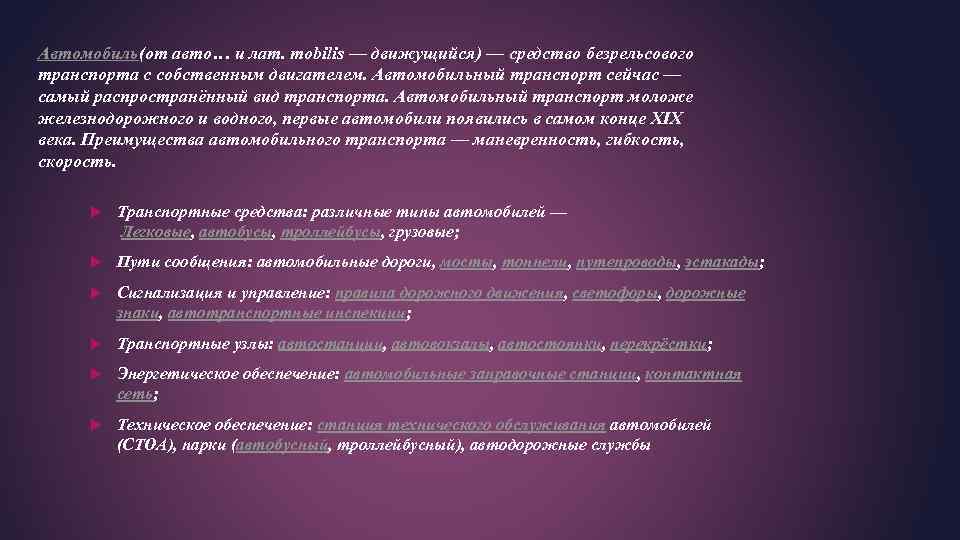 Автомобиль(от авто… и лат. mobilis — движущийся) — средство безрельсового транспорта с собственным двигателем. Автомобильный транспорт сейчас — самый распространённый вид транспорта. Автомобильный транспорт моложе железнодорожного и водного, первые автомобили появились в самом конце XIX века. Преимущества автомобильного транспорта — маневренность, гибкость, скорость. Транспортные средства: различные типы автомобилей — Легковые, автобусы, троллейбусы, грузовые; Пути сообщения: автомобильные дороги, мосты, тоннели, путепроводы, эстакады; Сигнализация и управление: правила дорожного движения, светофоры, дорожные знаки, автотранспортные инспекции; Транспортные узлы: автостанции, автовокзалы, автостоянки, перекрёстки; Энергетическое обеспечение: автомобильные заправочные станции, контактная сеть; Техническое обеспечение: станция технического обслуживания автомобилей (СТОА), парки (автобусный, троллейбусный), автодорожные службы
