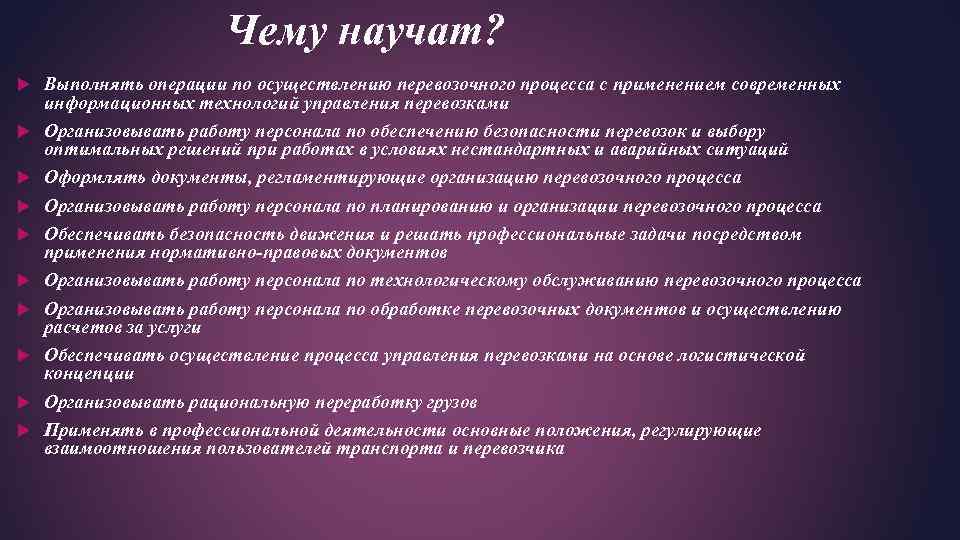 Чему научат? Выполнять операции по осуществлению перевозочного процесса с применением современных информационных технологий управления перевозками Организовывать работу персонала по обеспечению безопасности перевозок и выбору оптимальных решений при работах в условиях нестандартных и аварийных ситуаций Оформлять документы, регламентирующие организацию перевозочного процесса Организовывать работу персонала по планированию и организации перевозочного процесса Обеспечивать безопасность движения и решать профессиональные задачи посредством применения нормативно-правовых документов Организовывать работу персонала по технологическому обслуживанию перевозочного процесса Организовывать работу персонала по обработке перевозочных документов и осуществлению расчетов за услуги Обеспечивать осуществление процесса управления перевозками на основе логистической концепции Организовывать рациональную переработку грузов Применять в профессиональной деятельности основные положения, регулирующие взаимоотношения пользователей транспорта и перевозчика