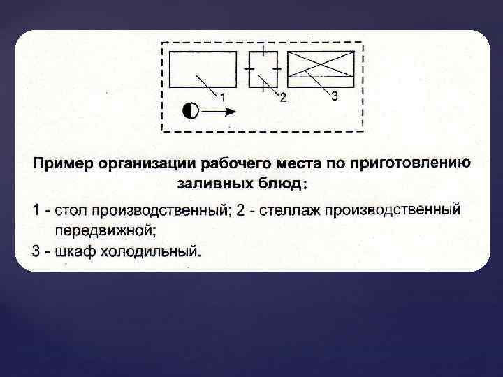 Место расположения Холодный цех организуется на предприятиях с цеховой структурой производства (в ресторанах, столовой, кафе и др. ). На специализированных предприятиях и в хозяйствах небольшой мощности, реализующих небольшой ассортимент холодных закусок, имеющих бесцеховую структуру, для приготовления холодных Холодный цех расположен вблизи раздачи, блюд отводится отдельное моечной столовой посуды и горячего цеха рабочее место в общем для того, чтобы производить тепловую производственном обработку продуктов, необходимых для помещении. приготовления холодных блюд.