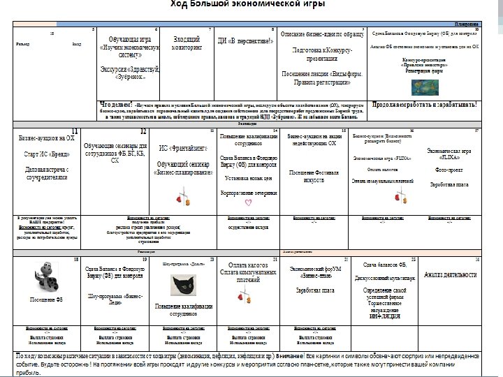 • Участники игры: все отряды, сформированные из детей среднего и старшего возраста, которые в игровой ситуации представляют собой один коллектив предприятия. • Время реализации игры: 19 дней • Игровая цель игры: перейти на новый финансовый уровень и по максимуму заработать прибыль. • Уровни: 1 уровень – наемные работники 2 уровень – предприниматели 3 уровень – влиятельные бизнесмены На территории центра размещены как реальные, так и вымышленные объекты хозяйствования (далее - ОХ), которые, согласно игровой ситуации, различны по размеру. • Виды ОХ: М – малое предприятие С – среднее предприятие К – крупное предприятие