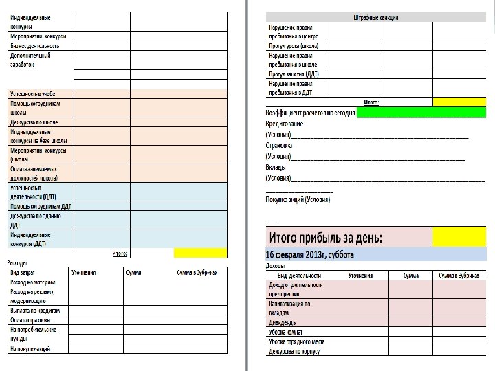 Фондовая биржа (ФБ) – финансовое предприятие, не подлежащее приватизации. Брокер: ведущий методист смены. Состоит из представителей актива структурной единицы «Лазурная» , которые получают доход от деятельности в зависимости от активности. Функции: контролирует приватизацию; контролирует движение финансов в БЭИ; анализирует состояние экономики 1 раз в 4 дня; устанавливает соответствующие цены на ОХ и акции предприятий; выполняет контролирующую функцию игры. Коммерческий банк (КБ) - финансовое предприятие, не подлежащее приватизации. Занимается денежными операциями: выплата доходов фирмам, изымание налогов и коммунальных платежей, оплата по страхованию, кредитование, вклады, обмен валют, текущий анализ деятельности фирм (ведение индекса активности Доу-Джонса). Специалист коммерческого банка: педагог-организатор корпуса. Страховая компания (СК) - финансовое предприятие, не подлежащее приватизации. Занимается операциями по страхованию. Условия страхования: … Биржа труда – коммерческое предприятие, не подлежащее приватизации. Занимается поиском нанимателей и соискателей, обеспечивает возможность дополнительного заработка для участников игры. Управляющий: начальник структурной единицы «Лазурная» . В состав входят представители АДИ «Биржа труда» . Оплата труда сотрудников БТ: зависит от степени активности и эффективности работы (от сделки).