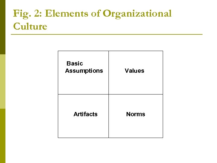 Fig. 2: Elements of Organizational Culture Basic Assumptions Values Artifacts Norms