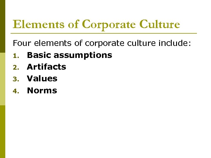 Elements of Corporate Culture Four elements of corporate culture include: 1. Basic assumptions 2. Artifacts 3. Values 4. Norms