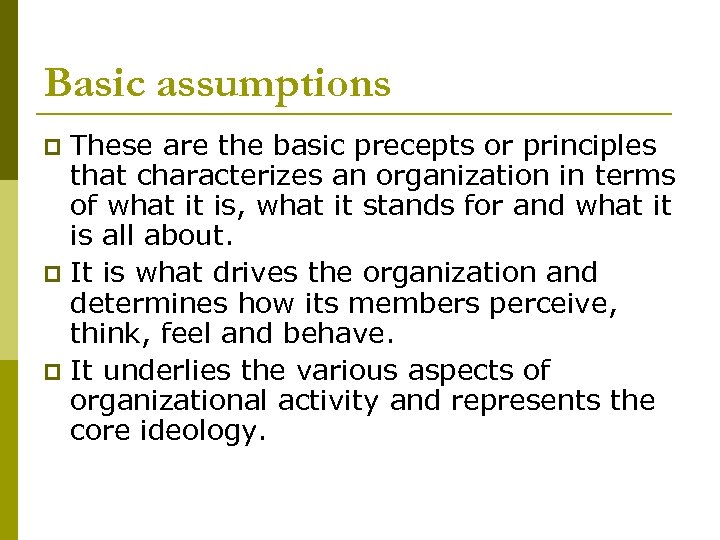 Basic assumptions These are the basic precepts or principles that characterizes an organization in terms of what it is, what it stands for and what it is all about. p It is what drives the organization and determines how its members perceive, think, feel and behave. p It underlies the various aspects of organizational activity and represents the core ideology. p