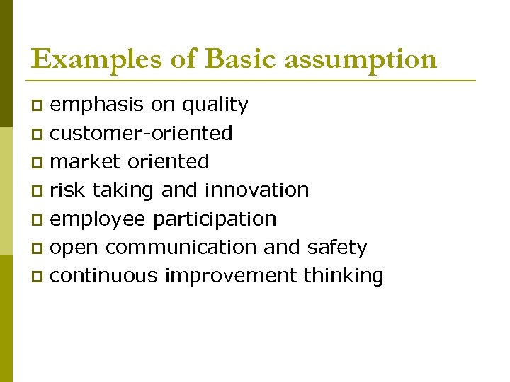 Examples of Basic assumption emphasis on quality p customer-oriented p market oriented p risk taking and innovation p employee participation p open communication and safety p continuous improvement thinking p