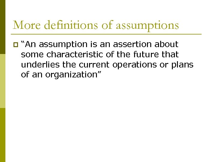 More definitions of assumptions p “An assumption is an assertion about some characteristic of the future that underlies the current operations or plans of an organization”