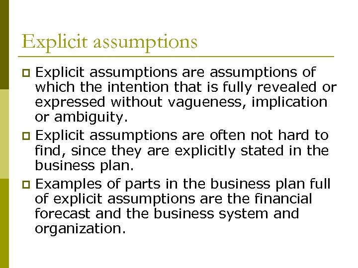 Explicit assumptions are assumptions of which the intention that is fully revealed or expressed without vagueness, implication or ambiguity. p Explicit assumptions are often not hard to find, since they are explicitly stated in the business plan. p Examples of parts in the business plan full of explicit assumptions are the financial forecast and the business system and organization. p