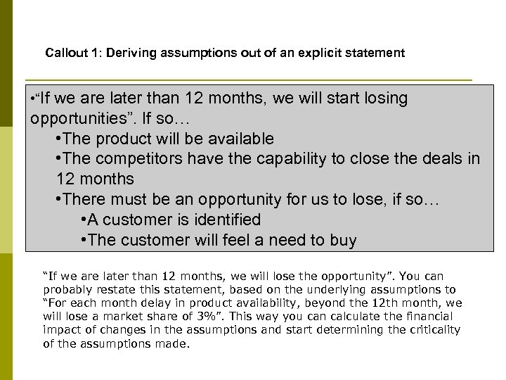 Callout 1: Deriving assumptions out of an explicit statement • “If we are later than 12 months, we will start losing opportunities”. If so… • The product will be available • The competitors have the capability to close the deals in 12 months • There must be an opportunity for us to lose, if so… • A customer is identified • The customer will feel a need to buy “If we are later than 12 months, we will lose the opportunity”. You can probably restate this statement, based on the underlying assumptions to “For each month delay in product availability, beyond the 12 th month, we will lose a market share of 3%”. This way you can calculate the financial impact of changes in the assumptions and start determining the criticality of the assumptions made.