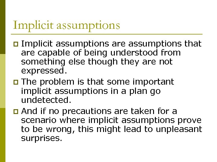 Implicit assumptions are assumptions that are capable of being understood from something else though they are not expressed. p The problem is that some important implicit assumptions in a plan go undetected. p And if no precautions are taken for a scenario where implicit assumptions prove to be wrong, this might lead to unpleasant surprises. p