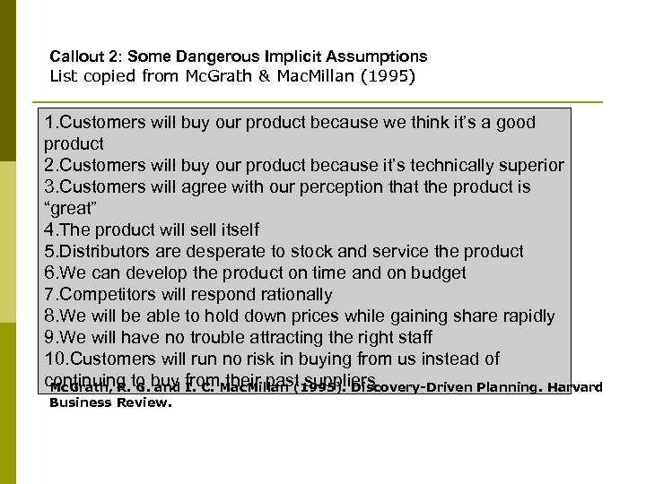 Callout 2: Some Dangerous Implicit Assumptions List copied from Mc. Grath & Mac. Millan (1995) 1. Customers will buy our product because we think it’s a good product 2. Customers will buy our product because it’s technically superior 3. Customers will agree with our perception that the product is “great” 4. The product will sell itself 5. Distributors are desperate to stock and service the product 6. We can develop the product on time and on budget 7. Competitors will respond rationally 8. We will be able to hold down prices while gaining share rapidly 9. We will have no trouble attracting the right staff 10. Customers will run no risk in buying from us instead of continuing to buy from. Mac. Millan (1995). Discovery-Driven Planning. Harvard Mc. Grath, R. G. and I. C. their past suppliers Business Review.