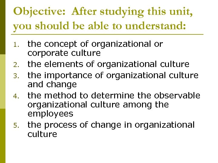 Objective: After studying this unit, you should be able to understand: 1. 2. 3. 4. 5. the concept of organizational or corporate culture the elements of organizational culture the importance of organizational culture and change the method to determine the observable organizational culture among the employees the process of change in organizational culture