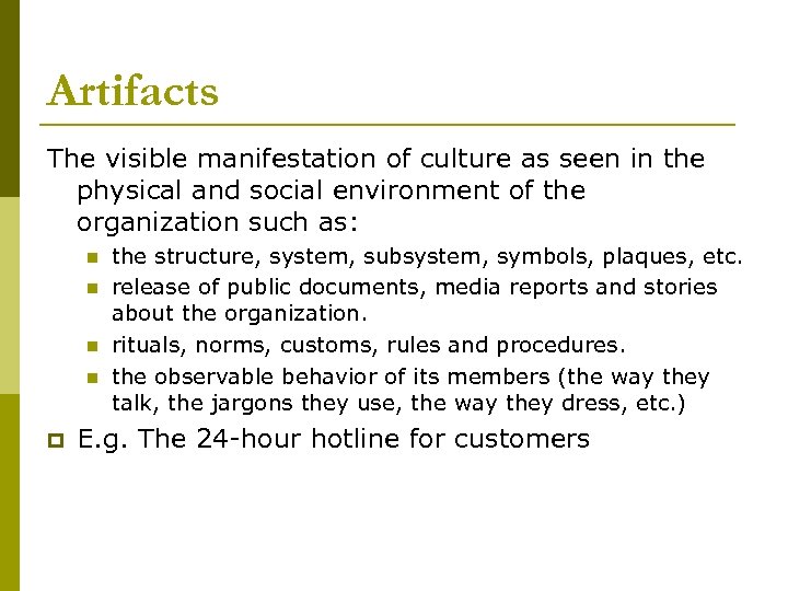Artifacts The visible manifestation of culture as seen in the physical and social environment of the organization such as: n n p the structure, system, subsystem, symbols, plaques, etc. release of public documents, media reports and stories about the organization. rituals, norms, customs, rules and procedures. the observable behavior of its members (the way they talk, the jargons they use, the way they dress, etc. ) E. g. The 24 -hour hotline for customers