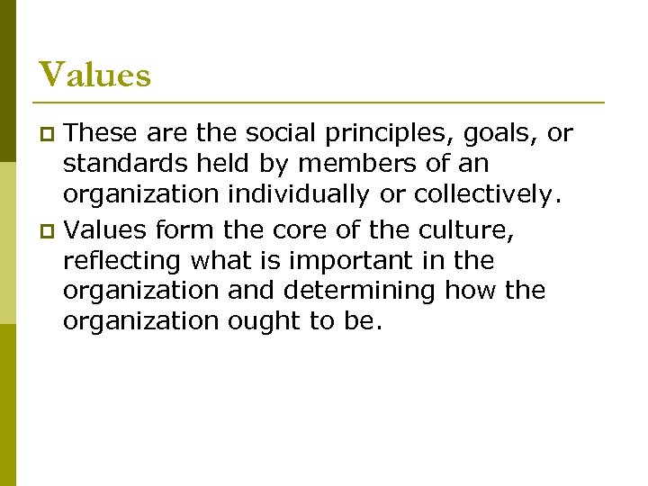 Values These are the social principles, goals, or standards held by members of an organization individually or collectively. p Values form the core of the culture, reflecting what is important in the organization and determining how the organization ought to be. p