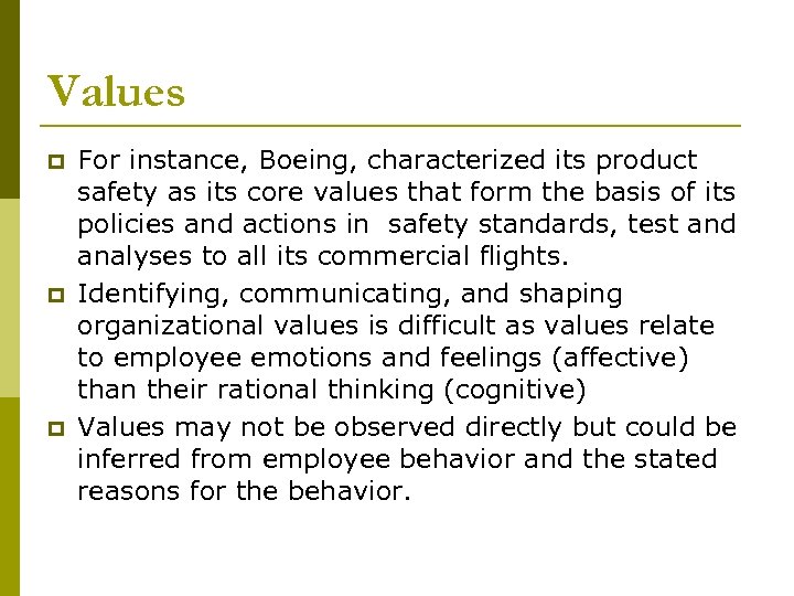 Values p p p For instance, Boeing, characterized its product safety as its core values that form the basis of its policies and actions in safety standards, test and analyses to all its commercial flights. Identifying, communicating, and shaping organizational values is difficult as values relate to employee emotions and feelings (affective) than their rational thinking (cognitive) Values may not be observed directly but could be inferred from employee behavior and the stated reasons for the behavior.