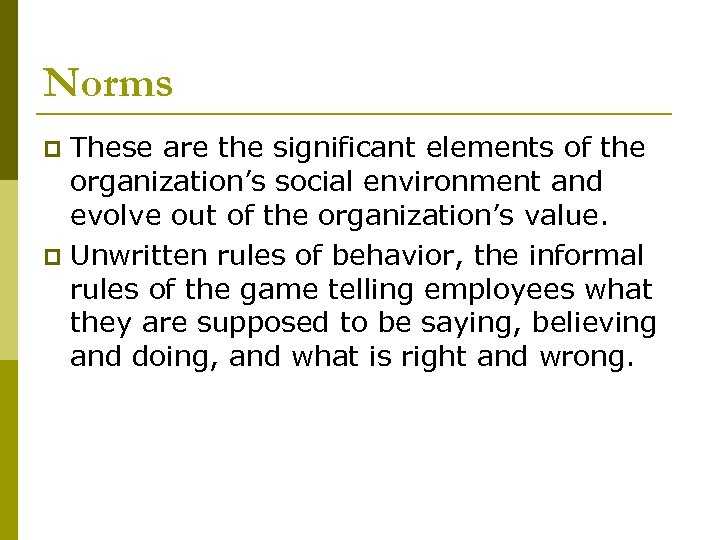 Norms These are the significant elements of the organization’s social environment and evolve out of the organization’s value. p Unwritten rules of behavior, the informal rules of the game telling employees what they are supposed to be saying, believing and doing, and what is right and wrong. p