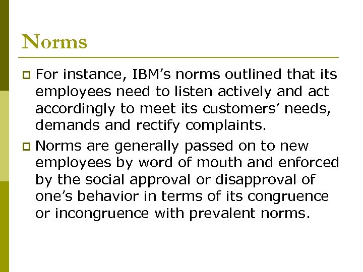 Norms For instance, IBM’s norms outlined that its employees need to listen actively and act accordingly to meet its customers’ needs, demands and rectify complaints. p Norms are generally passed on to new employees by word of mouth and enforced by the social approval or disapproval of one’s behavior in terms of its congruence or incongruence with prevalent norms. p