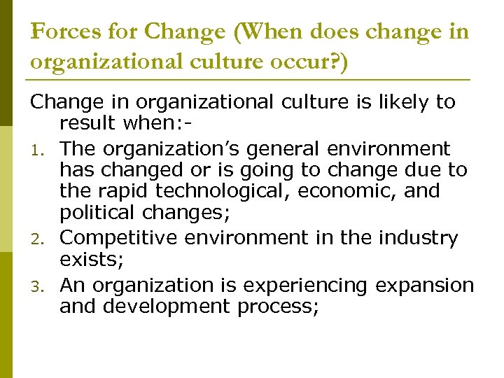 Forces for Change (When does change in organizational culture occur? ) Change in organizational culture is likely to result when: 1. The organization’s general environment has changed or is going to change due to the rapid technological, economic, and political changes; 2. Competitive environment in the industry exists; 3. An organization is experiencing expansion and development process;