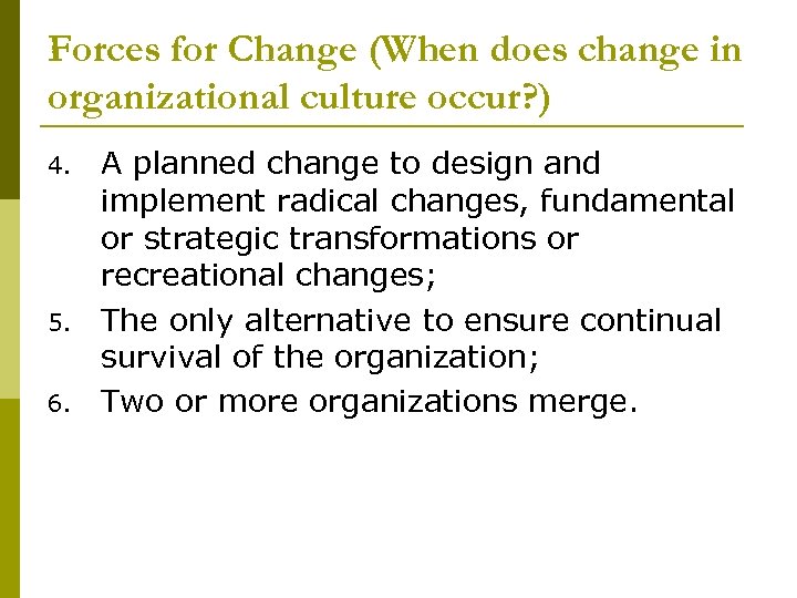 Forces for Change (When does change in organizational culture occur? ) 4. 5. 6. A planned change to design and implement radical changes, fundamental or strategic transformations or recreational changes; The only alternative to ensure continual survival of the organization; Two or more organizations merge.
