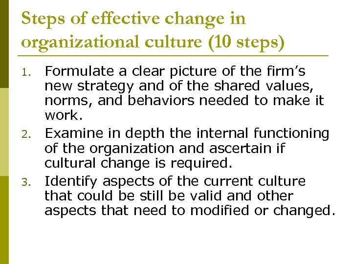 Steps of effective change in organizational culture (10 steps) 1. 2. 3. Formulate a clear picture of the firm’s new strategy and of the shared values, norms, and behaviors needed to make it work. Examine in depth the internal functioning of the organization and ascertain if cultural change is required. Identify aspects of the current culture that could be still be valid and other aspects that need to modified or changed.