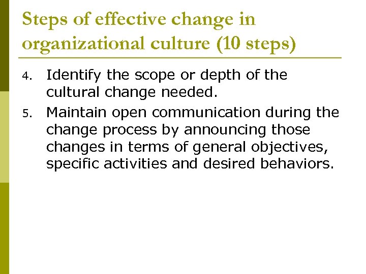 Steps of effective change in organizational culture (10 steps) 4. 5. Identify the scope or depth of the cultural change needed. Maintain open communication during the change process by announcing those changes in terms of general objectives, specific activities and desired behaviors.