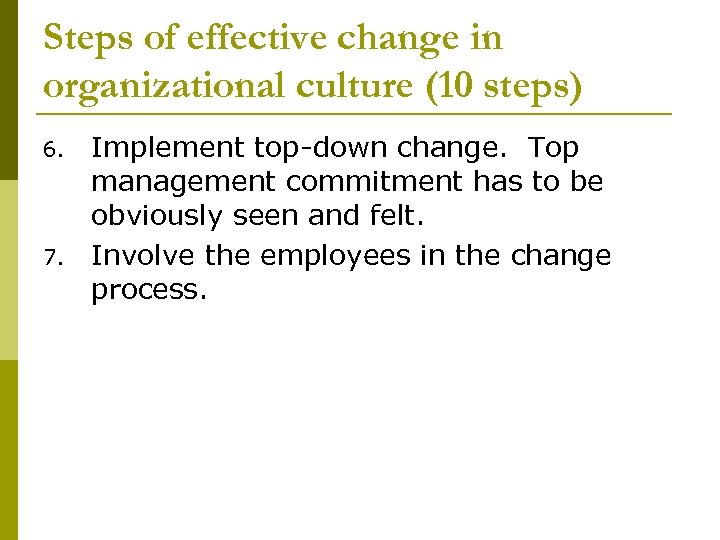 Steps of effective change in organizational culture (10 steps) 6. 7. Implement top-down change. Top management commitment has to be obviously seen and felt. Involve the employees in the change process.
