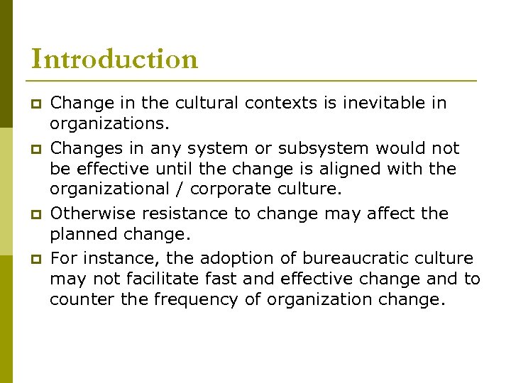 Introduction p p Change in the cultural contexts is inevitable in organizations. Changes in any system or subsystem would not be effective until the change is aligned with the organizational / corporate culture. Otherwise resistance to change may affect the planned change. For instance, the adoption of bureaucratic culture may not facilitate fast and effective change and to counter the frequency of organization change.