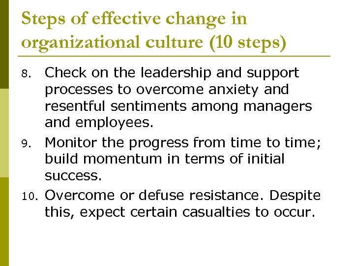 Steps of effective change in organizational culture (10 steps) 8. 9. 10. Check on the leadership and support processes to overcome anxiety and resentful sentiments among managers and employees. Monitor the progress from time to time; build momentum in terms of initial success. Overcome or defuse resistance. Despite this, expect certain casualties to occur.