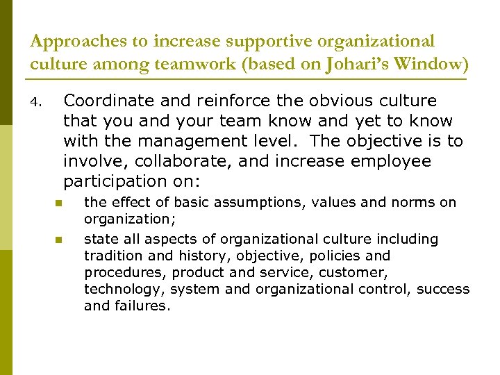 Approaches to increase supportive organizational culture among teamwork (based on Johari’s Window) Coordinate and reinforce the obvious culture that you and your team know and yet to know with the management level. The objective is to involve, collaborate, and increase employee participation on: 4. n n the effect of basic assumptions, values and norms on organization; state all aspects of organizational culture including tradition and history, objective, policies and procedures, product and service, customer, technology, system and organizational control, success and failures.
