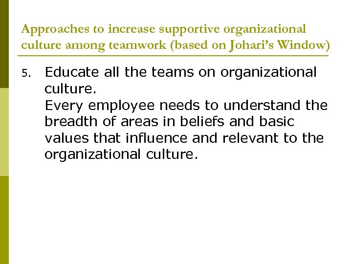 Approaches to increase supportive organizational culture among teamwork (based on Johari’s Window) 5. Educate all the teams on organizational culture. Every employee needs to understand the breadth of areas in beliefs and basic values that influence and relevant to the organizational culture.