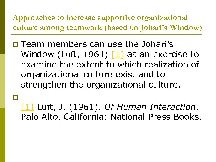 Approaches to increase supportive organizational culture among teamwork (based 0 n Johari’s Window) p Team members can use the Johari’s Window (Luft, 1961) [1] as an exercise to examine the extent to which realization of organizational culture exist and to strengthen the organizational culture. p [1] Luft, J. (1961). Of Human Interaction. Palo Alto, California: National Press Books.