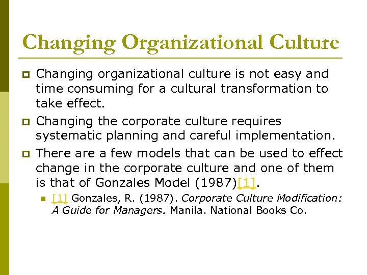 Changing Organizational Culture p p p Changing organizational culture is not easy and time consuming for a cultural transformation to take effect. Changing the corporate culture requires systematic planning and careful implementation. There a few models that can be used to effect change in the corporate culture and one of them is that of Gonzales Model (1987)[1]. n [1] Gonzales, R. (1987). Corporate Culture Modification: A Guide for Managers. Manila. National Books Co.