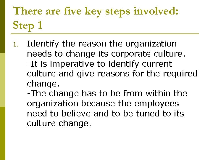 There are five key steps involved: Step 1 1. Identify the reason the organization needs to change its corporate culture. -It is imperative to identify current culture and give reasons for the required change. -The change has to be from within the organization because the employees need to believe and to be tuned to its culture change.