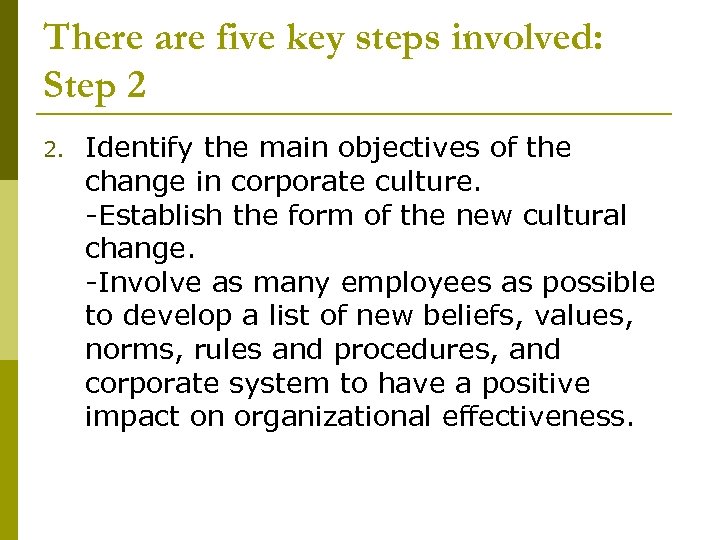 There are five key steps involved: Step 2 2. Identify the main objectives of the change in corporate culture. -Establish the form of the new cultural change. -Involve as many employees as possible to develop a list of new beliefs, values, norms, rules and procedures, and corporate system to have a positive impact on organizational effectiveness.