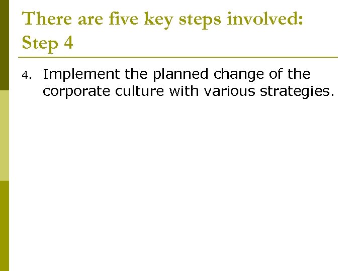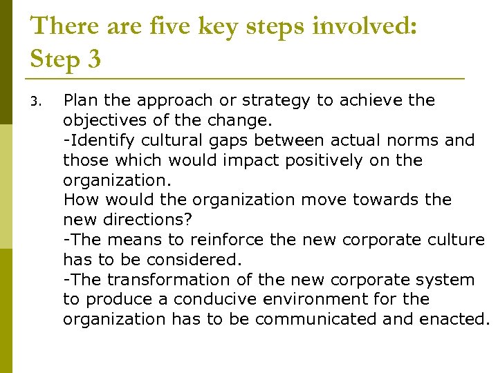 There are five key steps involved: Step 3 3. Plan the approach or strategy to achieve the objectives of the change. -Identify cultural gaps between actual norms and those which would impact positively on the organization. How would the organization move towards the new directions? -The means to reinforce the new corporate culture has to be considered. -The transformation of the new corporate system to produce a conducive environment for the organization has to be communicated and enacted.