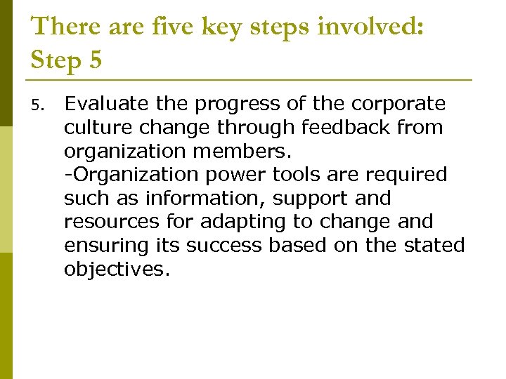 There are five key steps involved: Step 5 5. Evaluate the progress of the corporate culture change through feedback from organization members. -Organization power tools are required such as information, support and resources for adapting to change and ensuring its success based on the stated objectives.