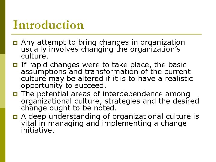 Introduction p p Any attempt to bring changes in organization usually involves changing the organization’s culture. If rapid changes were to take place, the basic assumptions and transformation of the current culture may be altered if it is to have a realistic opportunity to succeed. The potential areas of interdependence among organizational culture, strategies and the desired change ought to be noted. A deep understanding of organizational culture is vital in managing and implementing a change initiative.