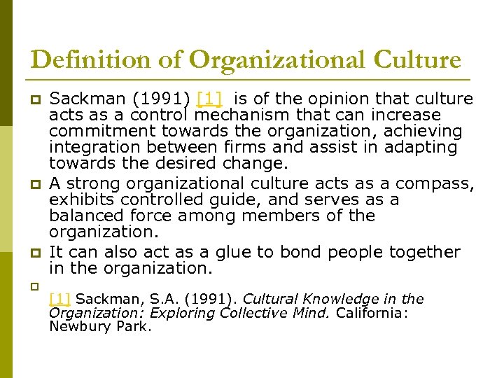 Definition of Organizational Culture p p Sackman (1991) [1] is of the opinion that culture acts as a control mechanism that can increase commitment towards the organization, achieving integration between firms and assist in adapting towards the desired change. A strong organizational culture acts as a compass, exhibits controlled guide, and serves as a balanced force among members of the organization. It can also act as a glue to bond people together in the organization. [1] Sackman, S. A. (1991). Cultural Knowledge in the Organization: Exploring Collective Mind. California: Newbury Park.