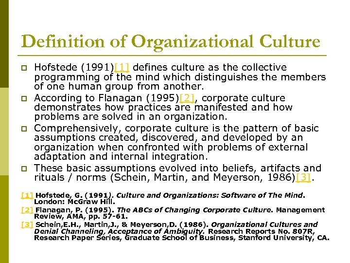 Definition of Organizational Culture p p Hofstede (1991)[1] defines culture as the collective programming of the mind which distinguishes the members of one human group from another. According to Flanagan (1995)[2], corporate culture demonstrates how practices are manifested and how problems are solved in an organization. Comprehensively, corporate culture is the pattern of basic assumptions created, discovered, and developed by an organization when confronted with problems of external adaptation and internal integration. These basic assumptions evolved into beliefs, artifacts and rituals / norms (Schein, Martin, and Meyerson, 1986)[3]. [1] Hofstede, G. (1991). Culture and Organizations: Software of The Mind. London: Mc. Graw Hill. [2] Flanagan, P. (1995). The ABCs of Changing Corporate Culture. Management Review, AMA, pp. 57 -61. [3] Schein, E. H. , Martin, J. , & Meyerson, D. (1986). Organizational Cultures and Denial Channeling, Acceptance of Ambiguity. Research Reports No. 807 R, Research Paper Series, Graduate School of Business, Stanford University, CA.