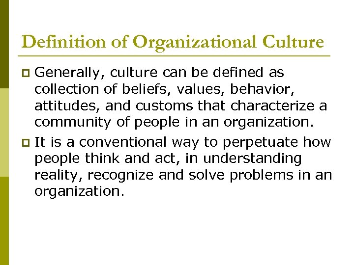 Definition of Organizational Culture Generally, culture can be defined as collection of beliefs, values, behavior, attitudes, and customs that characterize a community of people in an organization. p It is a conventional way to perpetuate how people think and act, in understanding reality, recognize and solve problems in an organization. p