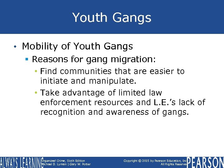 Youth Gangs • Mobility of Youth Gangs § Reasons for gang migration: • Find communities that are easier to initiate and manipulate. • Take advantage of limited law enforcement resources and L. E. ’s lack of recognition and awareness of gangs. Organized Crime, Sixth Edition Michael D. Lyman | Gary W. Potter Copyright © 2015 by Pearson Education, Inc. All Rights Reserved