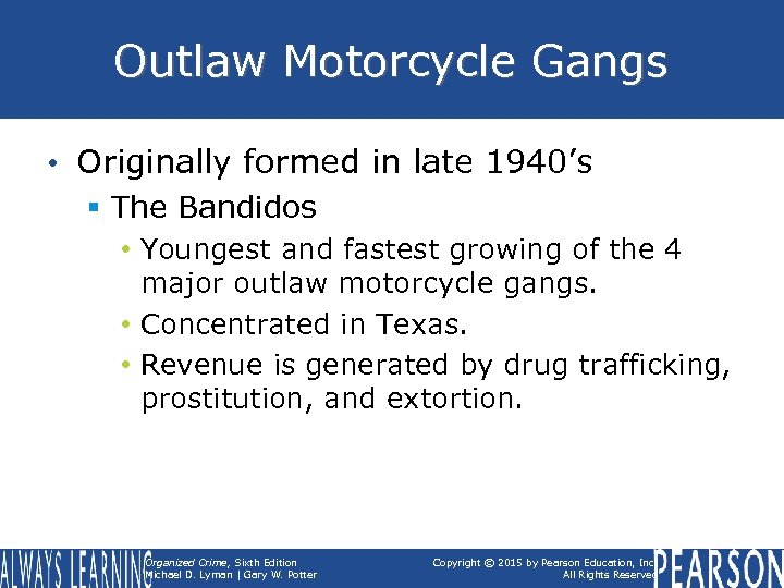 Outlaw Motorcycle Gangs • Originally formed in late 1940’s § The Bandidos • Youngest and fastest growing of the 4 major outlaw motorcycle gangs. • Concentrated in Texas. • Revenue is generated by drug trafficking, prostitution, and extortion. Organized Crime, Sixth Edition Michael D. Lyman | Gary W. Potter Copyright © 2015 by Pearson Education, Inc. All Rights Reserved